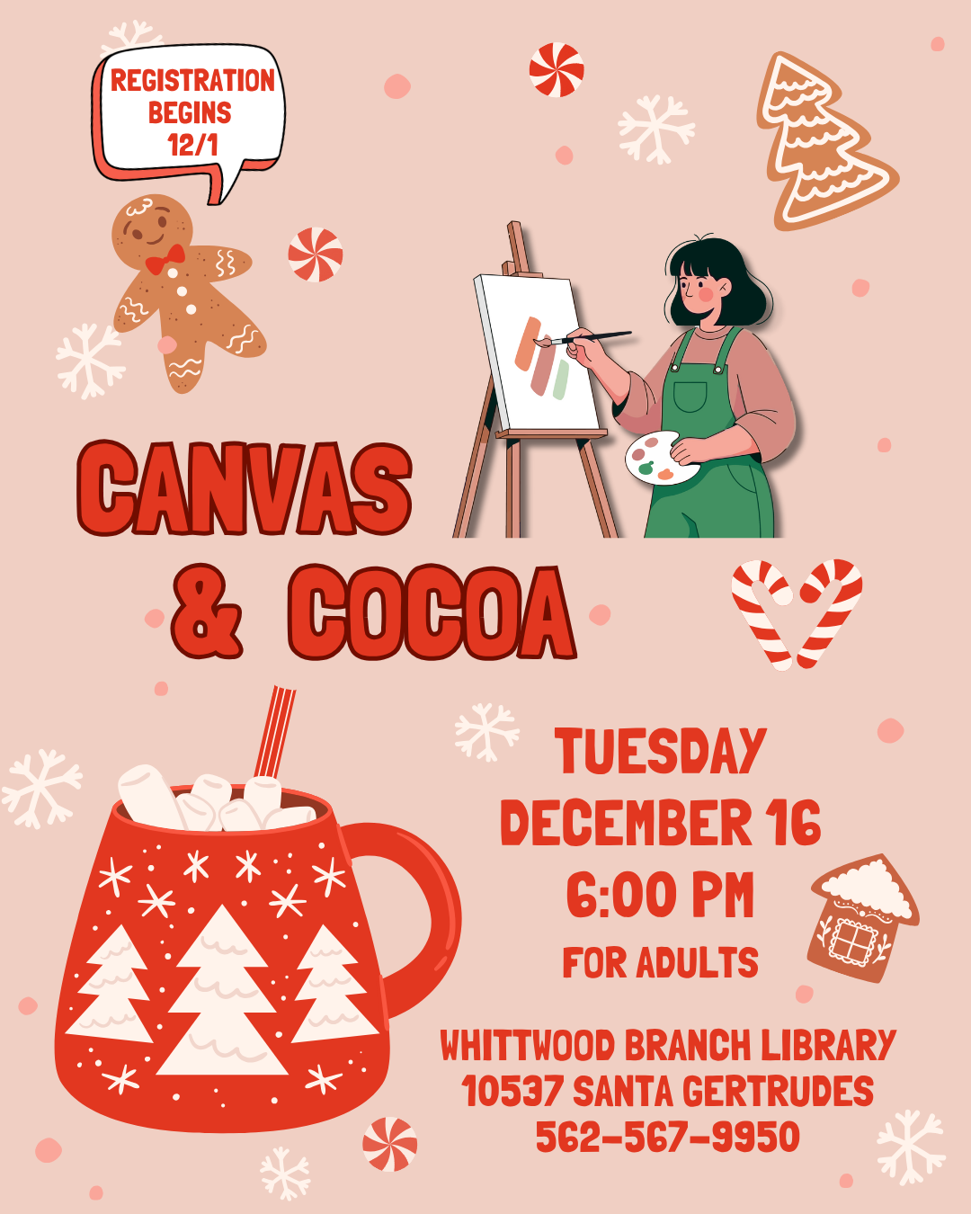 This exciting, yet cozy paint class will teach you about various types of brush techniques. Come learn about perspective, shading, and proportions. And yes, there will be a hot cocoa bar available too! The fun happens here at Whittwood Branch library on December 16th at 6pm. Limited spots, register at Whittwood Branch library or by calling 562-567-9950