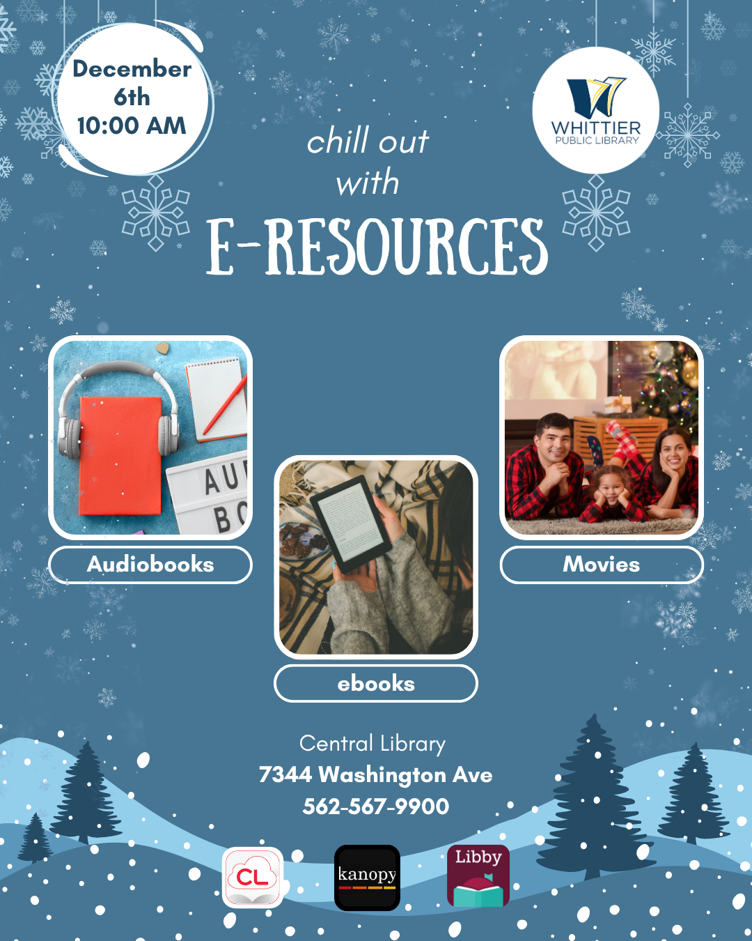 Central Library 7344 S. Washington Ave, Whittier, United StatesThe library might take a little holiday break soon… but your books and movies don’t have to! 😄 Learn how to use Libby, CloudLibrary, and Kanopy so you can read, watch, and listen anywhere this winter season. Saturday December 6th, at 10 AM at the Central Library's Homework Center (upstairs), bring your up-to-date library card,…