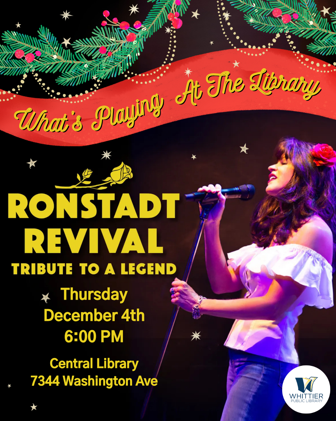 Central Library 7344 S. Washington Ave, Whittier, United StatesHoliday Concert Alert! Join us on Thursday, December 4 at 6 p.m. at the Whittier Central Library for a magical evening of music with Shannon Rae and Jeff Hale — two members of the touring band Ronstadt Revival – A Tribute to the Legendary Linda Ronstadt!Enjoy an intimate acoustic set featuring some of Linda’s greatest…